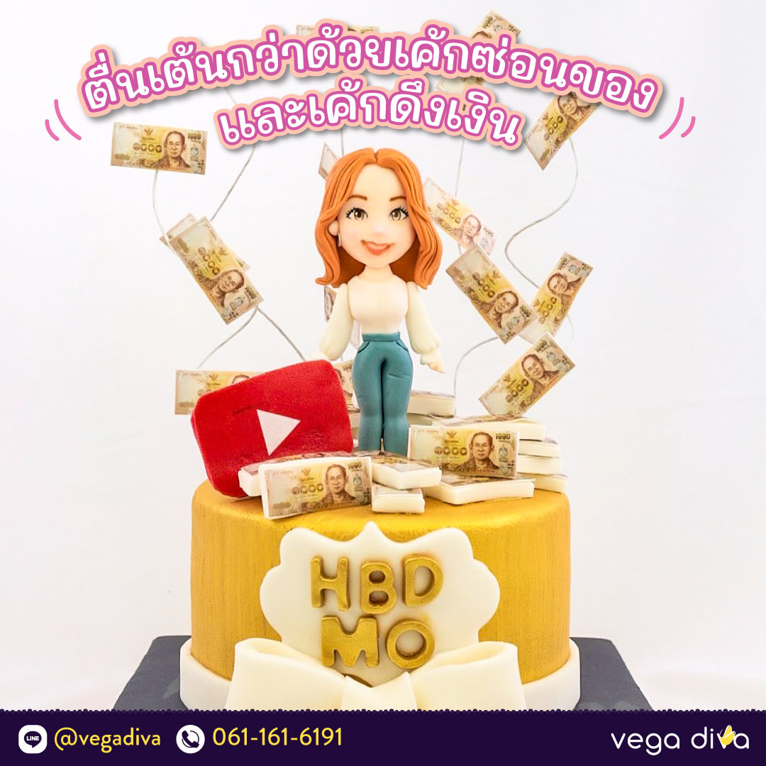 เค้กดึงเงินแบบแรก มาในธีมเค้กปั้น 3 มิติ บนตัวเค้กจะมีตัวการ์ตูนปั้นของผู้รับ มาพร้อมกับการใส่ความชอบของผู้รับด้วยดังเช่นไอคอนของแพลตฟอร์มอย่าง Youtube มาพร้อมกับด้ามจับไว้ให้ดึงเงินออกมาโดยจัดรูปแบบให้เหมือนกับมีเงินปลิวลอยอยู่บนเค้กสร้างความพิเศษให้กับเค้กไปอีกหนึ่งระดับ บอกเลยว่าสววยน่ารักกรุบกริบมาก ๆ ห้ามพลาดเลย!