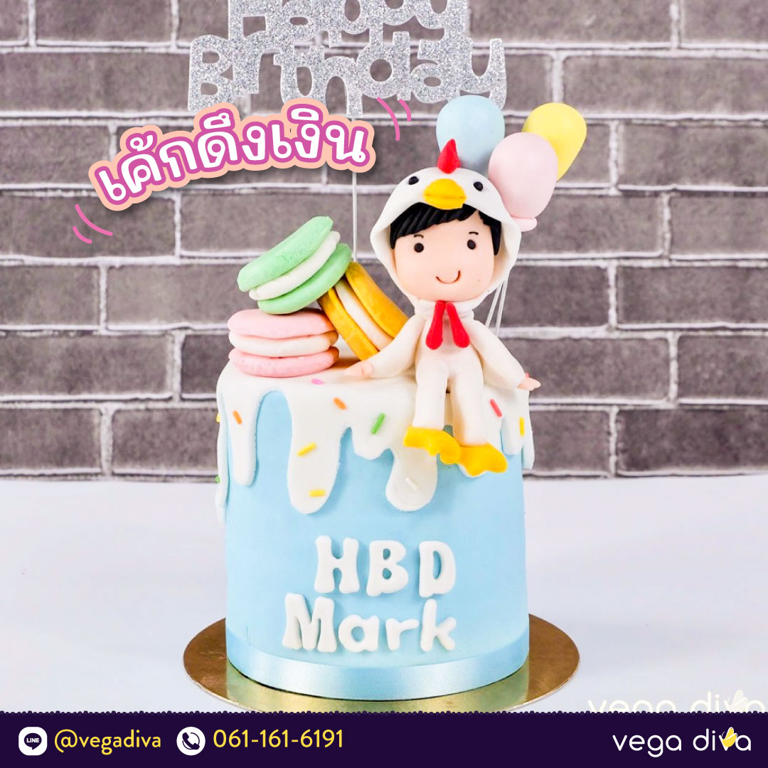 เค้กดึงเงินแบบต่อไปมาในแบบเค้กมาการองพร้อมกับการปั้นตกแต่งตัวการ์ตูนสามมิติของเจ้าของเค้ก เพิ่มความน่ารักอีกขั้นด้วยการใส่ชุดคอสตูมแสนพิเศษที่เรียกรอยยิ้มผู้รับได้อย่างดีด้วยชุดคอสตูมน้องไก่ ที่ไม่พูดถึงไม่ได้คือตัวมาการองแสนหอมหวาน อร่อย ด้านหลังปักด้วยก้านคำอวยพร Happy Birthday ซึ่งตรงนี้คุณเองสามารถนำแบบไปติดต่อแอดมิน เพื่อสร้างสรรค์ให้เป็นเค้กดึงเงิน เค้กซ่อนเงินได้ทุกเมื่อ รับรองว่าถูกใจผู้รับแน่นอน หรือจะเปลี่ยนตัวการ์ตูนปั้นจากการปั้นคน เป็นการ์ตูนตัวโปรด ก็ย่อมได้เสมอ!